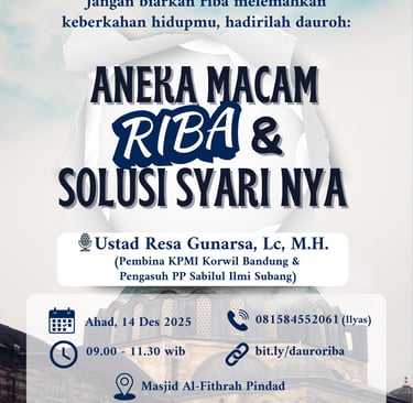 Riba merupakan salah satu perkara yang dilarang keras dalam Islam karena berdampak buruk terhadap keberkahan hidup, ketenangan hati, serta tatanan sosial dan ekonomi umat. Oleh karena itu, DKM Masjid Al-Fithrah Pindad menyelenggarakan kegiatan dauroh Islam sebagai sarana edukasi dan peningkatan pemahaman jamaah mengenai hakikat riba serta solusi syar’i dalam bermuamalah.