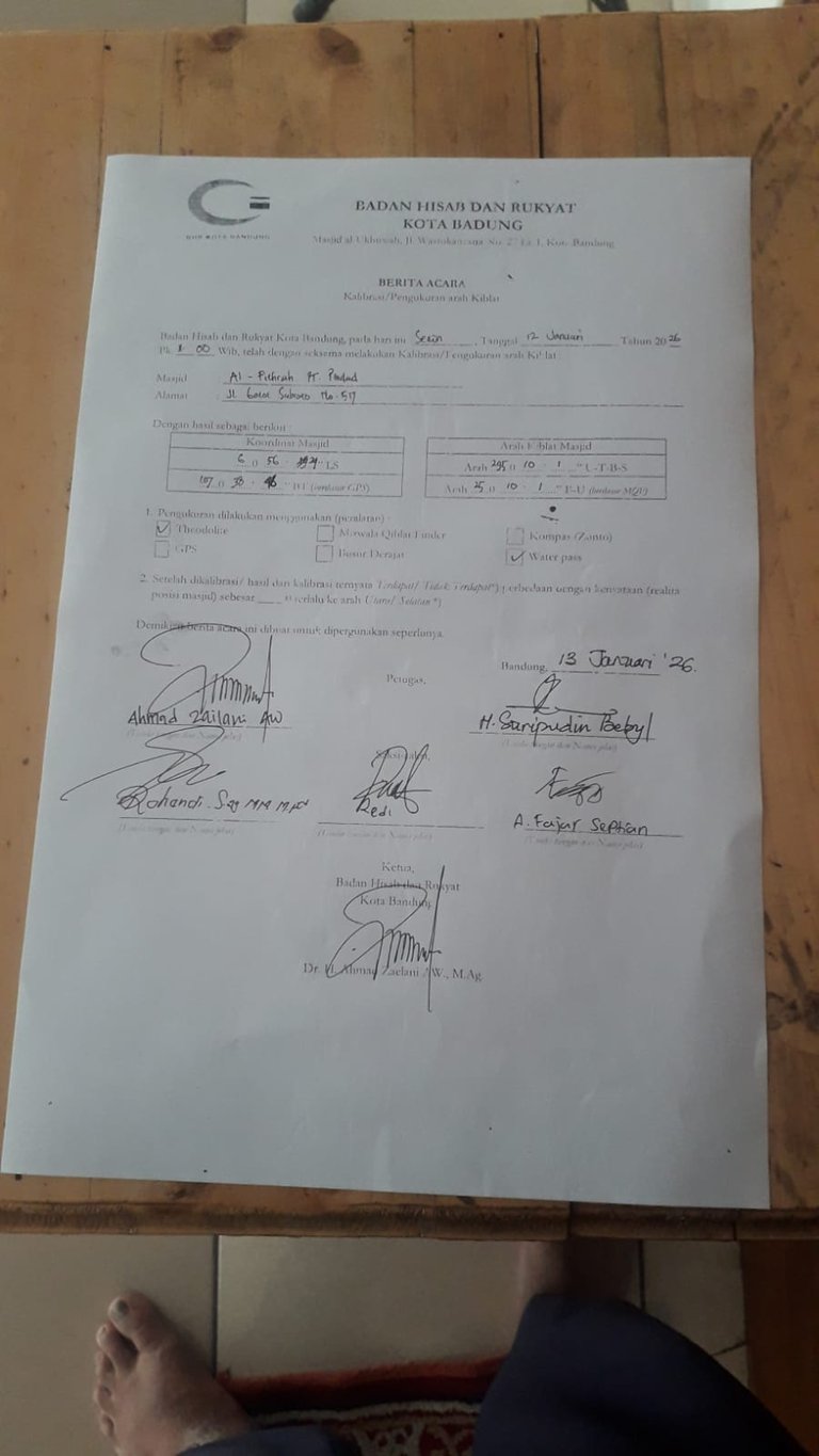 Berita acara hasil pengukuran arah kiblat ini secara resmi ditandatangani oleh petugas pelaksana dan Ketua Badan Hisab dan Rukyat Kota Bandung pada tanggal 13 Januari 2026 sebagai bentuk pengesahan dan pertanggungjawaban hasil kegiatan.