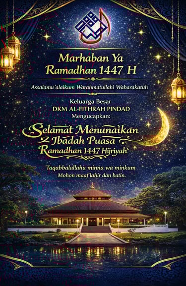 Kepada seluruh jamaah dan keluarga besar DKM Al-Fithrah, selamat menjalankan ibadah puasa. Semoga setiap langkah kita menuju ke arah kebaikan, dan Ramadhan kali ini menjadi pengingat yang manis bagi kita semua.