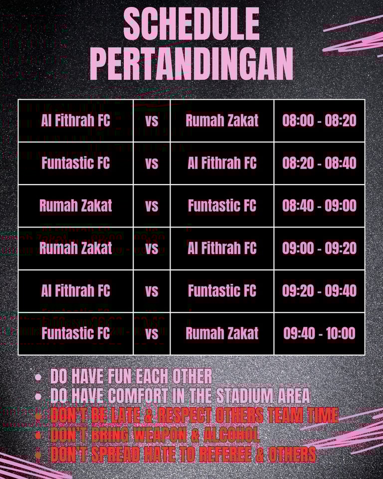 Turnamen Trofeo Silaturahmi Fun Football diikuti oleh tiga tim yang terdiri dari komunitas yang bersemangat, yaitu Al Fithrah FC, Rumah Zakat FC, dan Funtastic FC. Masing-masing tim membawa semangat kompetisi yang tinggi, namun tetap mengedepankan kebersamaan dan persahabatan. Kegiatan ini merupakan salah satu cara efektif untuk meningkatkan kebugaran, sekaligus memperkuat ukhuwah antar tim selama pertandingan berlangsung.